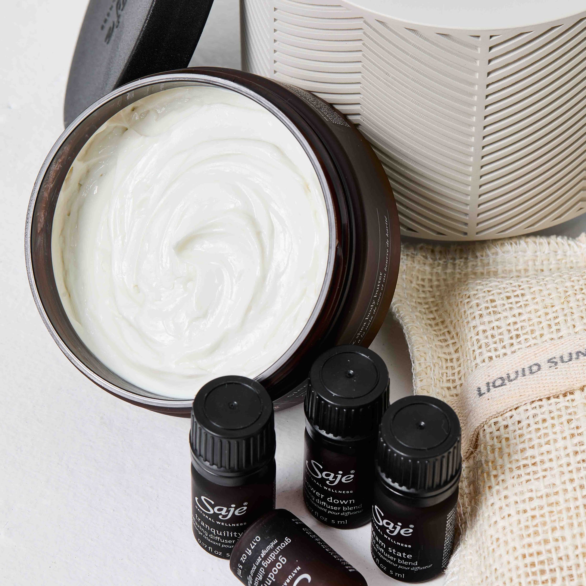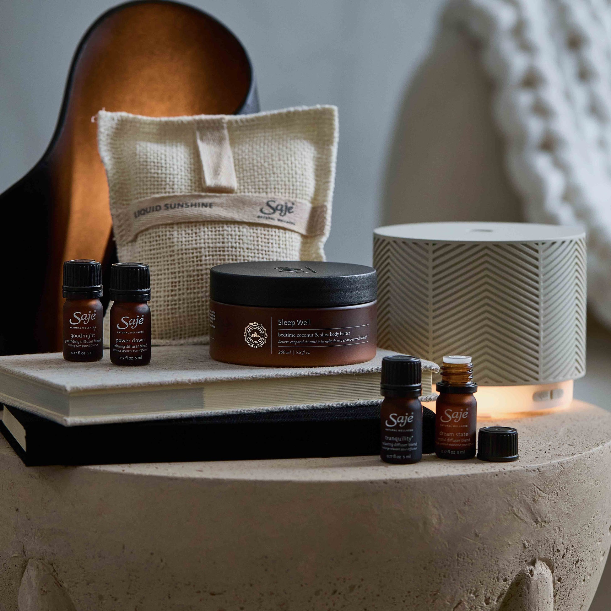 Elevate your daily routine with the Hush x Saje Good Days, Great Nights Kit – a thoughtfully curated collection featuring a revitalizing Jute and Joy wash pad, a soothing Ultrasonic diffuser with Sweet Dreams blends, and the nourishing Sleep Well Body Butter, designed to bring harmony to your mornings and serenity to your nights.